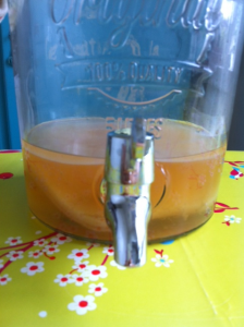 Pascal m’a conseillé d’acheter un grand récipient muni d’un robinet pour la mise en fermentation du kombucha. C’est en effet très pratique, car nous pouvons ainsi goûter le degré de maturation de la boisson. A part le thé et le sucre, mon seul investissement de base a été ce grand bocal acheté chez Aligro (contenance 5 litres, prix 30.00). J’ai ensuite conditionné la boisson finie dans des bouteilles récupérées, parfaitement hermétiques.